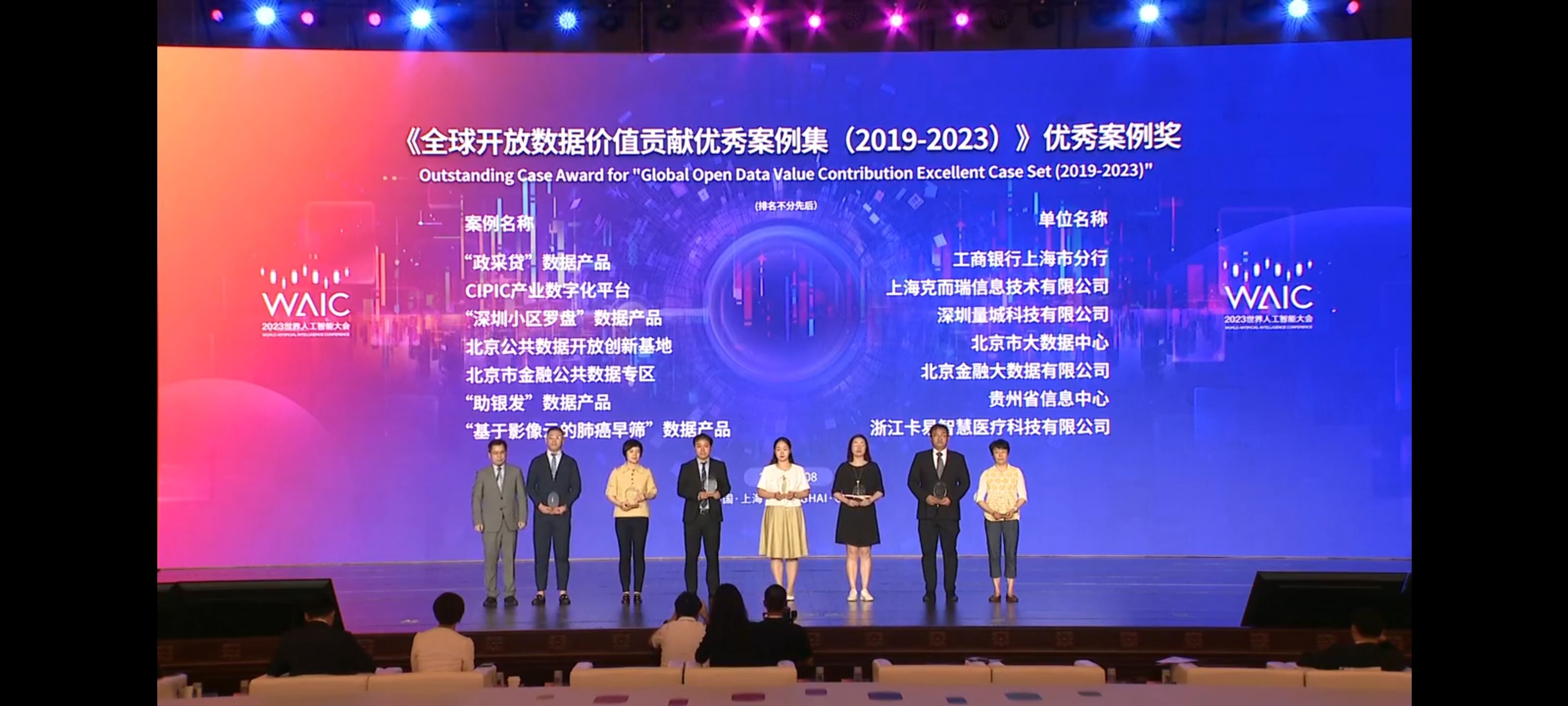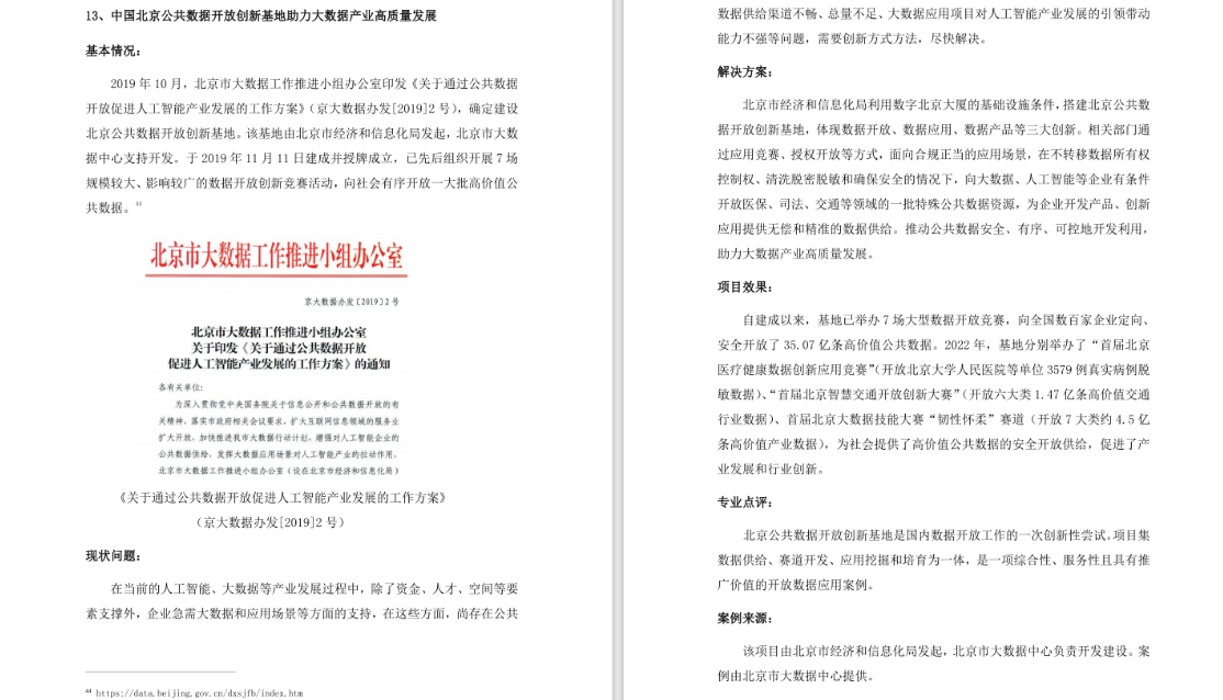 2023年7月8日,以“城起万象 命运共生”为主题的2023世界人工智能大会·国际AI城市论坛成功举办。北京市大数据中心凭借 “北京公共数据开放创新基地”,在由国家信息中心大数据发展部、上海社会科学院信息研究所、上海智慧城市发展研究院三家联合编撰的《全球开放数据价值贡献优秀案例集(2019-2023)》中,荣获优秀案例奖。2019年10月,北京市大数据工作推进小组办公室印发《关于通过公共数据开放促进人工智能产业发展的工作方案》(京大数据办发[2019]2号),确定建设北京公共数据开放创新基地。该基地由北京市经济和信息化局发起,北京市大数据中心支持开发,于2019年11月11日建成并授牌成立。北京公共数据开放创新基地自建成以来,累计开展了7场大型数据开放创新竞赛,先后受控开放了高价值的656万条司法数据(“‘AI+司法服务’创新竞赛”)、330G人工智能创新训练数据集(“2020北京数据开放创新应用大赛—科技战疫•大数据公益挑战赛”)、34亿条医保数据(“北京数智医保创新竞赛”)、150多万条回天地区数据(“北京‘智慧昌平’开放创新大赛”)、3579例真实病例脱敏数据(“首届北京医疗健康数据创新应用竞赛”)、1.47亿条交通数据(“首届北京智慧交通开放创新大赛”)、4.5亿条产业数据(“2022北京大数据技能大赛-韧性怀柔赛道”),为社会提供了高价值公共数据的安全开放供给,促进了产业发展和行业创新。