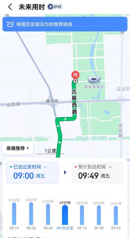 未来出行用时:各平台基于大数据和人工智能技术,综合历史相同时刻的路况等信息,为用户规划出行路线并预测出行时间。用户选择某一条路线后,选择“未来出行”选项或调整出发时间,即可查看当天及之后未来出发时刻的相应耗时。