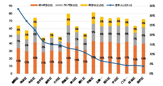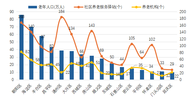 中国联通智慧足迹公司依托北京市公共数据开放平台发布的养老机构及养老驿站基础数据,融合手机信令大数据,对我市老年人口分布与现有养老资源进行了系统性评估,旨在识别各区、街道乡镇之间的养老资源分布现状及其差异,为后续优化配置、推动养老服务资源均衡布局提供科学依据。