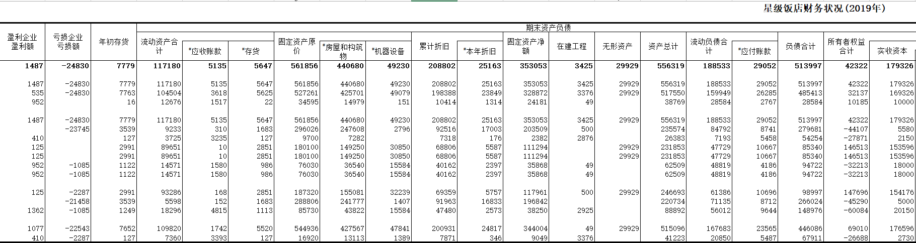 该数据是密云区提供的密云区星级饭店财务状况2019年信息,包括项目、企业个数个、亏损企业个数(个、盈利企业盈利额、亏损企业亏损额、年初存货、期末资产负债、损益及分配、人工成本及增值税、从事住宿和餐饮业活动的从业人员平均人数(人)等属性字段。