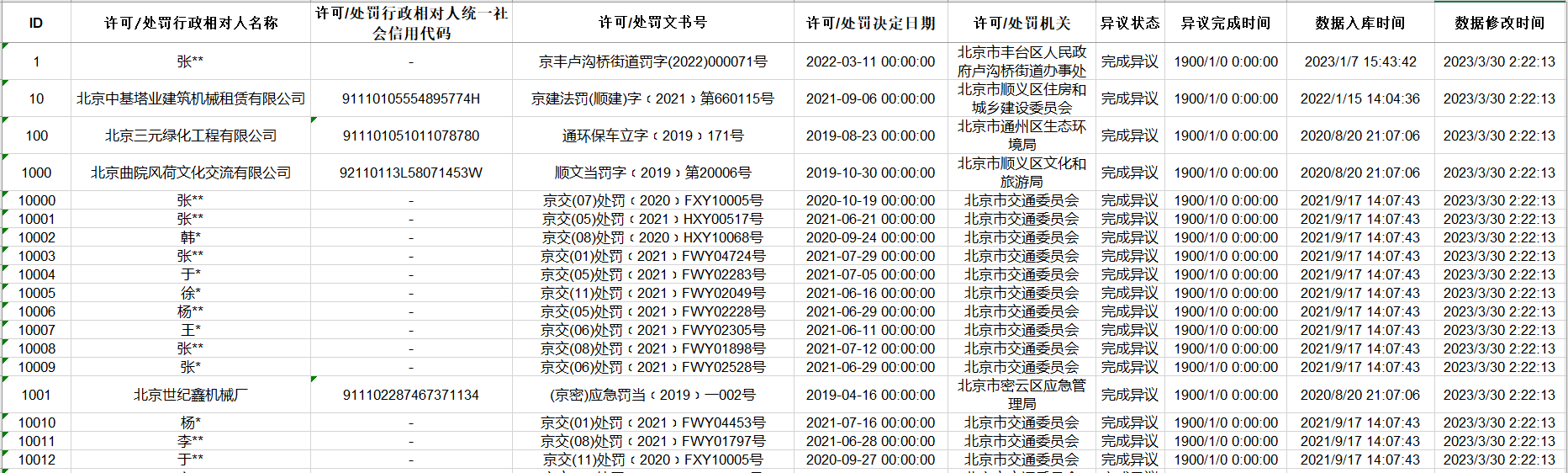 该数据是企业信用信息公示信息,包括ID、许可/处罚行政相对人名称、许可/处罚行政相对人统一社会信用代码、许可/处罚文书号、许可/处罚决定日期、许可/处罚机关、异议状态、异议完成时间、数据入库时间、数据修改时间等属性字段。