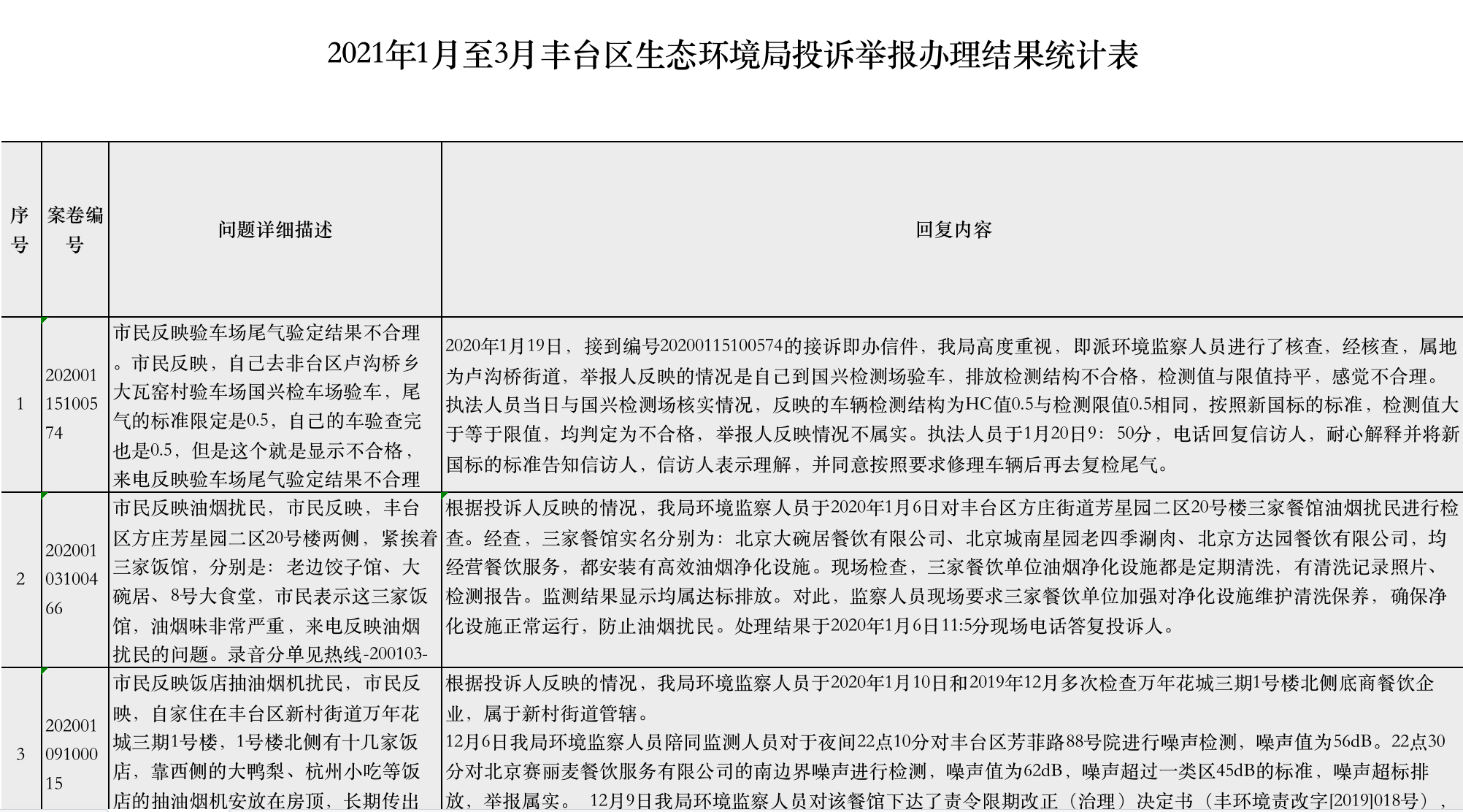 资源摘要 该数据是丰台区提供的2021年1月至3月丰台区生态环境局投诉举报办理结果统计表信息,包括序号,案卷编号,问题详细描述,回复内容等属性字段。