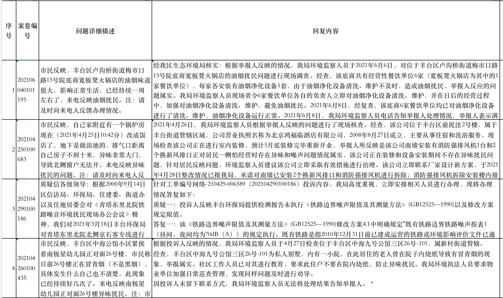 该数据是丰台区提供的2021年4月至6月丰台区生态环境局投诉举报办理结果统计表信息,包括序号,案卷编号,问题详细描述,回复内容等属性字段。