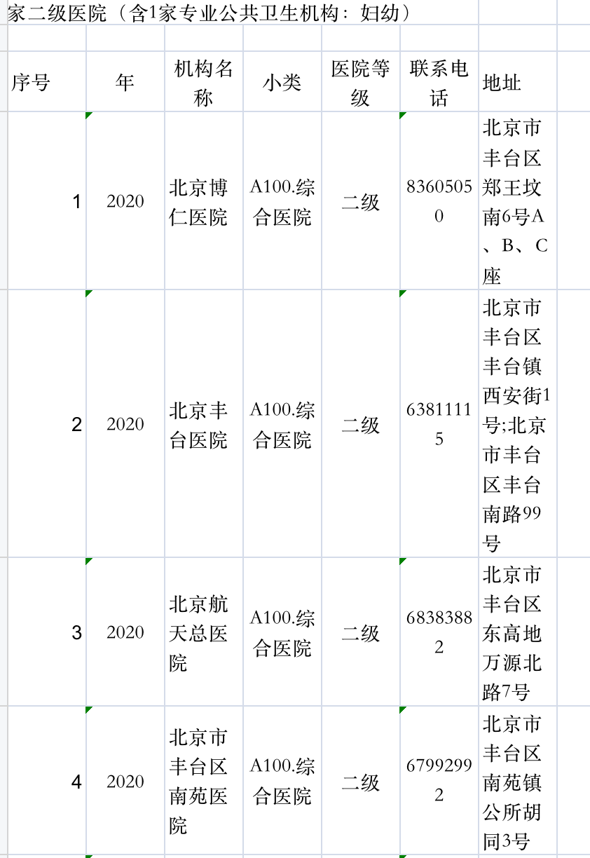 该数据是丰台区提供的丰台区二级医院信息,包括序号,年,机构名称,小类,医院等级,联系电话,地址等属性字段。