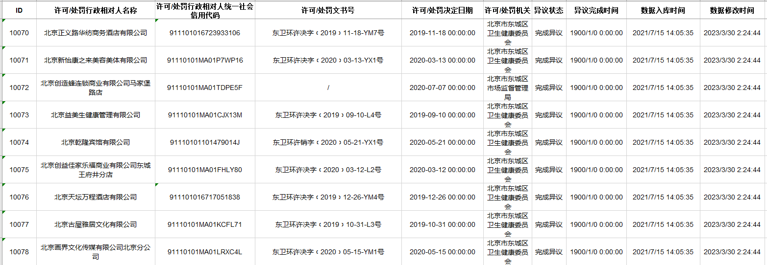 该数据是企业信用信息公示信息,包括ID、许可/处罚行政相对人名称、许可/处罚行政相对人统一社会信用代码、许可/处罚文书号、许可/处罚决定日期、许可/处罚机关、异议状态、异议完成时间、数据入库时间、数据修改时间等属性字段。